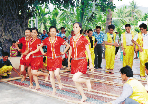 | 海南创建生态村,琼岛盛开文明花。图为三亚市凤凰镇的文明生态村槟榔村的黎族姑娘和小伙在练习竹竿舞。 新华社记者 章磊 摄 |