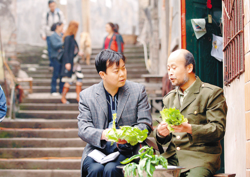 | ↑在重庆市南岸区弹子石街道的老街,《重庆晚报》的巷子记者向军(左)在采访。 |