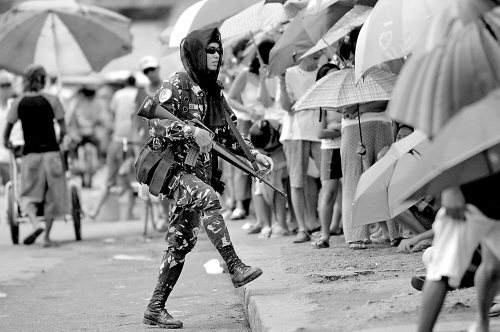 4月15日,在菲律宾首都马尼拉郊外,一名菲律宾军人在排队等候购买政府补贴进口大米的人群旁警戒。 据报道,菲律宾国家粮食署计划今年进口大米220万吨,其中5月份将进口50万吨,以此解决可能出现的粮食短缺问题。 新华社/法新