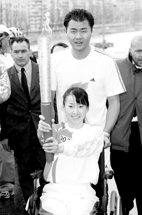 | ←北京奥运会圣火传递活动在法国巴黎举行时,残疾人火炬手金晶手持火炬传递。 新华社发 |