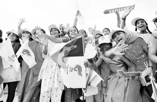 | ←4月14日,北京奥运圣火传递活动在阿曼马斯喀特举行。图为在马斯喀特的海滨公路,一些印度裔儿童手举旗帜,等待奥运圣火的到来。 新华社发 |