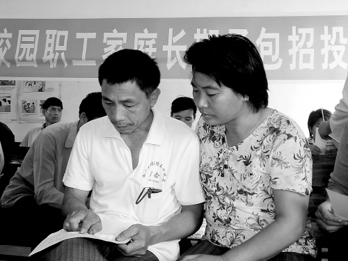 | 3月22日下午,金江农场12队的韦俊昌、石英梅夫妇,正在认真研究投标书的内容,准备竞投橡胶树位的长期承包经营权。 本报记者 孙乐明 摄 |