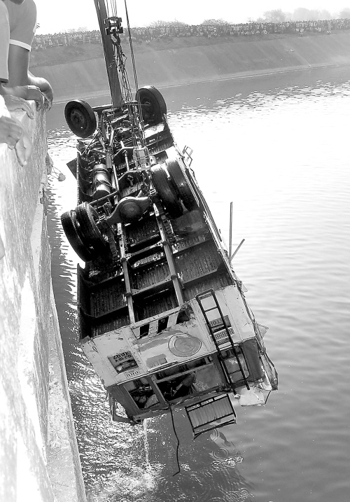 4月16日,印度一辆载有大批学生的公交车在博德利村行驶途中坠入运河,造成至少44人死亡。新华社/法新