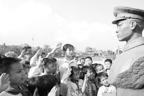 | 斯人已逝,风范长存。李向群的精神在不断传承。图为向群小学的孩子们向李向群的塑像敬礼。 鲁海涛 摄 |