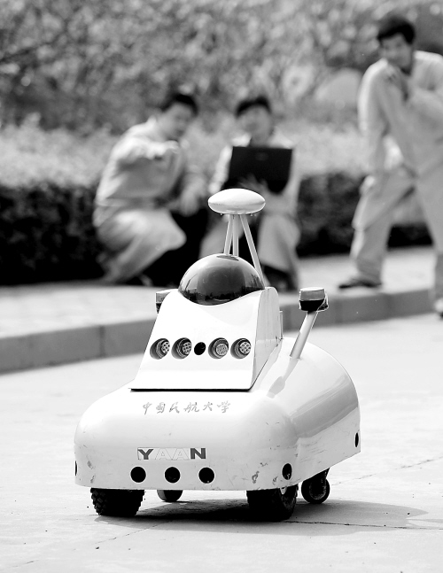 由中国民航大学地面特种设备研究基地机器人研究所等单位合作开发的中国首款双向语音传输和自主充电功能保安巡逻机器人于近日研制成功。该款机器人可在各种复杂环境和天气条件下,自主完成巡逻和重点部位察看任务,不仅具有全方位视觉处理判断能力,而且还能够进行双向语音信息的远程传输与监控。 据了解,该款机器人可以协助保安管理人员有效地完成区域安全保障工作,检测环境烟雾、火灾情况并进行异常情况报警,可主要应用于民航机场、住宅小区、重要仓库、商场及其他公共场所。 新华社记者 刘海峰 摄