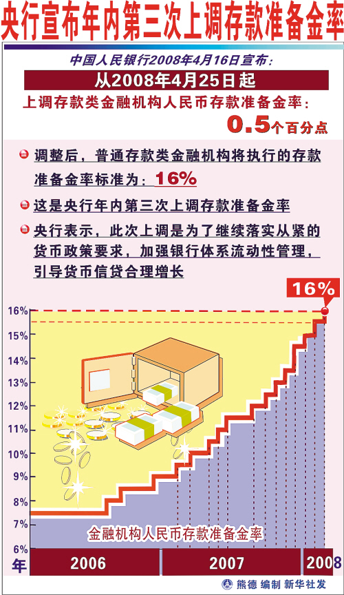 新华社北京4月16日电 (记者姚均芳 王宇)中国人民银行16日宣布,自4月25日起上调存款类金融机构人民币存款准备金率0.5个百分点,此次上调后,普通存款类金融机构将执行16%的存款准备金率标准。