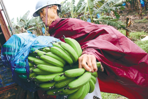 ←4月18日中午,琼海市塔洋镇的香蕉种植户老陈忙着抢收香蕉。 本报记者 王凯 摄