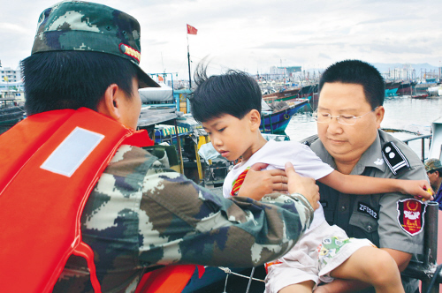 ↑4月18日,三亚边防官兵在转移该市河西区水上居住的渔民及其孩子。特约记者 孙清 摄
