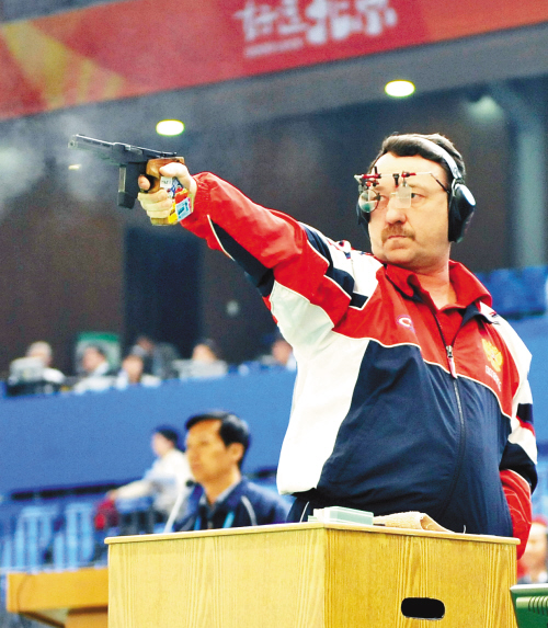 | 19日,在“好运北京”世界杯赛男子25米手枪速射决赛中,俄罗斯选手阿利费连科夺冠。 新华社发 |
