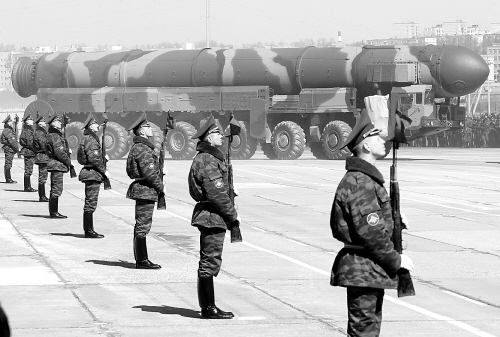 4月22日,在俄罗斯首都莫斯科郊外的俄军某训练基地,俄军举行红场阅兵式前最后一次彩排。5月9日,俄罗斯将在莫斯科红场举行阅兵式,庆祝卫国战争胜利63周年。俄罗斯将在时隔17年后重新在红场阅兵式上展示其最现代化的重型武器和飞机。 新华社记者沈伯韩摄
