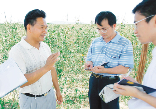| ↓4月21日,农民黄正光讲述胡锦涛总书记到他家田间的情形。 本报记者 苏晓杰 摄 |