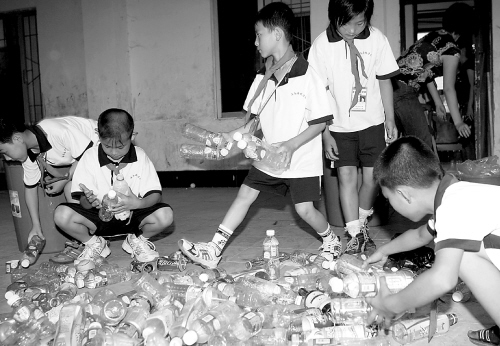 4月22日是第39个世界地球日,主题为“善待地球、从身边小事做起”。海口市琼山区海政学校四年级的同学们今天捡了285个矿泉水瓶。 自2005年以来,海政学校开展“环保小卫士”活动,收集空矿泉水瓶4万多个,废旧纸张1800多公斤。 图为海政学校四年级同学将回收的矿泉水瓶运送至学校储藏室。 本报记者 苏建强 摄
