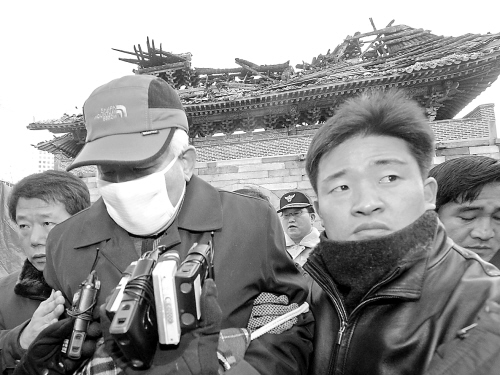 韩崇礼门纵火犯 被判10年徒刑 4月25日,韩国国宝级古建筑崇礼门纵火犯蔡正基被判处10年有期徒刑。这是2月15日,蔡正基(戴口罩者)在警察的押解下在被烧毁的崇礼门前接受记者采访的资料照片。 新华社/路透