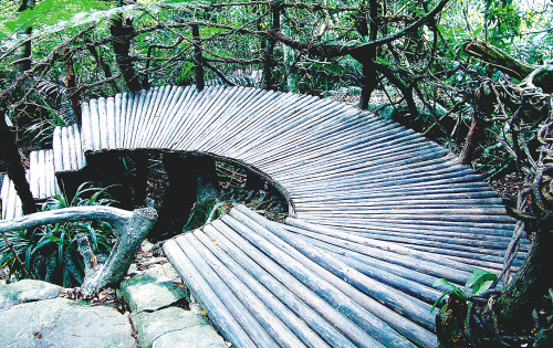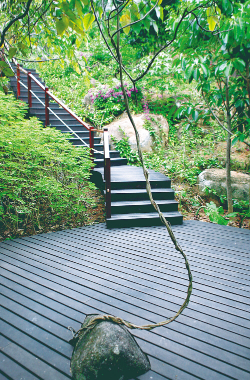 呀诺达雨林文化旅游区内4.6公里长的生态栈道“依山势而建、缘林姿而行”,穿行在1400多种乔木、140多种南药、80多种热带观赏花卉和数十种热带瓜果间。它将海南热带雨林的精华以最原始、最自然、最和谐、最清晰的方式呈现在游人面前。游人在尽情地呼吸绿色空气,沐浴在雨林氧吧中时,对绿色的渴望瞬间得到满足。亭榭、石凳、树桩,和谐优雅地散布在栈道边上,供到访者在稍感疲惫时小憩,尽显国际主题旅游必备的人文关怀。一泓花池、几汪泉水、层叠瀑布、肖形奇石、参天绿荫……无不让游客养眼醉心……
