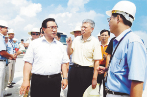 | 去年8月30日,交通部部长李盛霖(左一)来琼考察海南路桥建设项目。 |