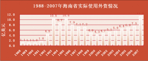 20年来,海南累计实际利用外资118亿美元。2007年,实际利用外资11.2亿美元,比上年增长49.5%,创历史新高。外资的来源由建省初期的几个国家和地区,扩展到60个国家和地区。利用外资的结构、质量进一步优化,外商投资的产业由传统产业向热带高效农业、生态环保、海岛度假休闲旅游以及新兴工业领域延伸。外资为海南大特区的开发建设做出了历史性的贡献。