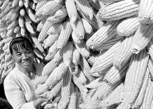 | 二○○七年九月十六日,贵州镇宁县朱家庄农民尹喜秀在翻晒刚收获的玉米(资料图片)。新华社记者 杨俊江 摄 |