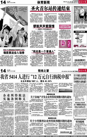 海南日报 体育新闻/税收之窗 014 2008-04-281 2008年04月28日 星期一