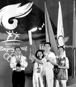 | 4月29日,北京奥运圣火传递活动在越南胡志明市举行。图为奥运火炬手阮氏秋霞(左一)在起跑仪式上展示点燃的火炬。 新华社发 |