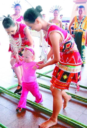 | 4月27日,东航莫斯科—三亚包机飞抵凤凰机场,身穿黎族服装的姑娘带着刚抵达的俄罗斯小游客跳起了竹竿舞。