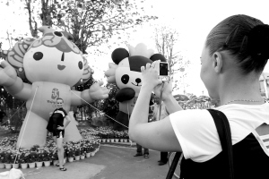 5月3日,不少游客来到三亚美丽之冠门口,与福娃合影留念。特约记者 孙清 摄