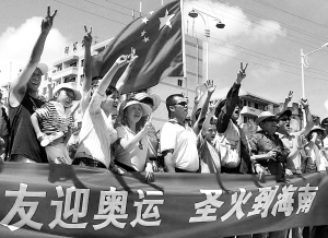 | 5月3日上午,100多名虎拜车友开着自驾车到琼海万泉河边,举行万人签名迎圣火活动。在现场,不少游客以及琼海市民纷纷加入迎圣火活动之中。 本报记者 古月 摄 |