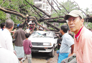 缅甸已有15000人 死于热带风暴侵袭 5月4日,在缅甸仰光,居民们正在搬动一辆被倾倒树木毁坏的汽车。据缅甸国家电视台当天的报道,刚刚过境缅甸的热带风暴已造成近15000人死亡,近3000人失踪。 新华社/路透