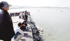 5月5日,韩国居民在忠清南道保宁市附近海域关注救援人员对幸存者的搜寻。据官方称,该地区4日突现的巨浪已造成至少9人死亡。 新华社/法新