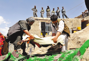 5月5日,在阿富汗首都喀布尔,几名阿富汗人将死者遗体抬离爆炸现场。阿富汗内政部称,几名儿童当天在玩耍时误将一枚陈年火箭引爆,造成4人死亡,1人受伤。 新华社/法新