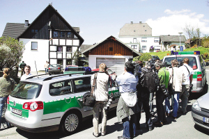 5月5日,媒体记者在德国西部波恩附近城镇发现婴儿尸体的地点采访。4日晚,德国警方在这所房屋地下室的冷库中发现3名新生婴儿的尸体。据警方说,这3名婴儿的母亲已经被捕。 新华社/路透
