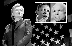 | 大选形成希拉里、奥巴马(左小图)和麦凯恩(右小图)三人的角逐。 |