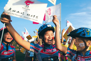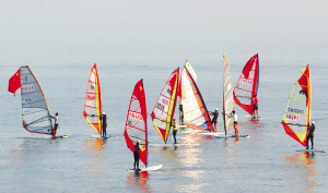 远处,波光粼粼的金色海面上,一片片色彩斑斓的帆板在海面上犁出一道道浪花,那是帆板运动员们在蓝色海洋上向即将到来的圣火致敬。起跑仪式舞台后的轮滑道上,来自海口市轮滑协会和奥武公司轮滑队的运动员挥舞着手中的国旗、奥运五环旗、北京奥运会标识旗,他们潇洒优美的动作和旗帜在运动中形成的优美曲线,为今天的现场增添了灵动之美。空中,彩色的热气球与碧蓝的天空、洁白的云朵一起,等待着火炬的到来。