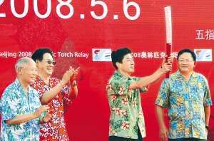 | 5月6日,北京奥运圣火传递活动在海口市举行。国际奥委会委员、中国奥委会名誉主席、北京奥组委执委何振梁(左一),省委副书记于迅(右二),省委常委、省纪委书记王为璐(左二),省委常委、海口市委书记陈辞(右一)出席仪式。 本版照片由本报记者 张 杰 李英挺 南海网张茂 摄 |