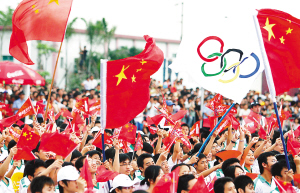 今天,气温非常高,中午时分达到摄氏35度。但火炬传递所经之处,成千上万的群众为奥运加油,为圣火助威。街道上随处可见高挂的奥运横幅、宣传画、各色彩旗,每个人都在享受着这个欢乐过程,无尽的喜悦荡漾在每一个人的脸上。