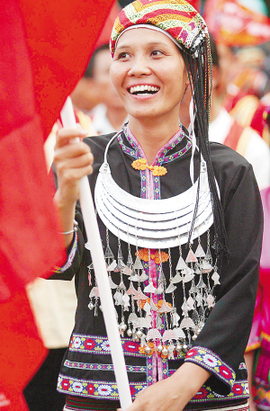 | → 5月5日,五指山市的三月三广场,黎族苗族群众喜迎奥运圣火。