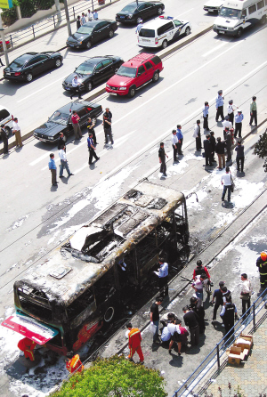 5日9时左右,上海杨浦区黄兴路靠近国权路附近一辆842路公交车发生火灾,目前公安部门确认已有3人死亡,12人受伤。上海市公安局人士表示,经过初步勘查,火灾系有人携带易燃物品上车所致。目前,警方正在对相关情况作进一步调查。这是当日拍摄的火灾现场。 新华社记者 裴鑫 摄