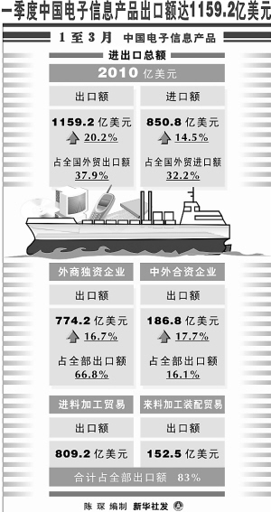 电子信息产品一贯是我国的出口“大户”。工业和信息化部6日发布的统计信息显示,1至3月,我国电子信息产品进出口总额达2010亿美元,其中出口额为1159.2亿美元,占全国外贸出口额的37.9%。 新华社发