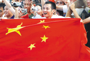 任冠群告诉记者,今天的圣火传递,很多火炬手都高喊着共同的口号“中国,加油”,就在那一刹那,他们都哭了。记者看到,他脸上的奥运五环标志被汗水冲刷得五彩斑斓,汗水湿透了身上的T恤衫,但手中的五星红旗仍然在迎风飘扬。