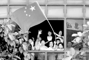 5月6日,北京奥运圣火在海口的传递,海口龙昆北路一小区的住户在家门口挥舞国旗为圣火欢呼、祝福。 本报记者 李英挺 摄