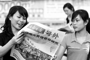 | ③ 读者在开心阅读本报“号外”。 本报记者 古月 摄 |