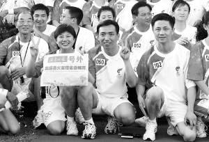 | ④ 火炬手、本报记者陈成智(前排中)与谭丽琳(前排左一)在展示本报当天发行的“号外”。 |