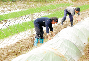 这是上月底南昌市新建县石埠乡璜源村农民在翻整水稻秧苗地膜。