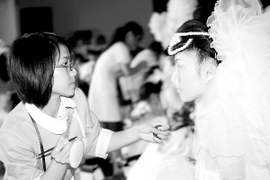 记者来到赛场时,学生们正聚精会神地进行新娘晚妆的比赛(见上图,苏建强摄)。身着洁白婚纱的模特安静地坐在椅子上,参赛学生拿起各式各样的“家伙”细心对新娘的脸上进行描画,打粉底、画眼影、画眼线、贴假睫毛……