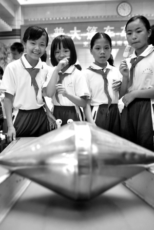 | 5月8日,第四届省科技活动月在省图书馆开幕,展馆内众多科普游戏受到青少年的喜爱。图为一只自动向坡上滚动的陀螺吸引了许多小学生的目光。