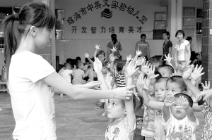 | →琼海市各家幼儿园加强防控手足口病。图为5月8日,琼海市中英文实验幼儿园的孩子们举起洗干净的小手让老师检查。