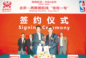 | 海南航空公司与NBA举行签约仪式,双方将联手推广于6月9日开通的中美新航线—北京—西雅图航线。这条航线是中美2007年达成新一轮航权谈判以来,国内航空公司首先开通的中美新航线,将由NBA巨星加里·佩顿担任形象代言人。