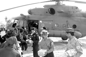 | ←5月8日,在缅甸热带风暴重灾区伊洛瓦底省,救援人员从直升飞机上卸下救灾物资。 新华社/缅通社 |