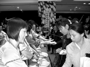 因为人来得太多,会场不得不限制每人每次领取香蕉不得超过2个。即使这样,排队等着品尝乐东香蕉的人也排成了10多米的长龙。10多名分发香蕉的工作人员累得手发麻,连吃午饭的时间都挤不出来了。一个半小时的品尝会,共计5吨222箱的乐东香蕉全被品尝。