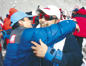 | 5月9日,登山队长王勇峰(右)返回珠峰大本营时受到热烈欢迎。 新华社发 |