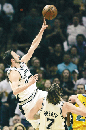 | 马刺队球员吉诺比利(左)突破防守上篮。